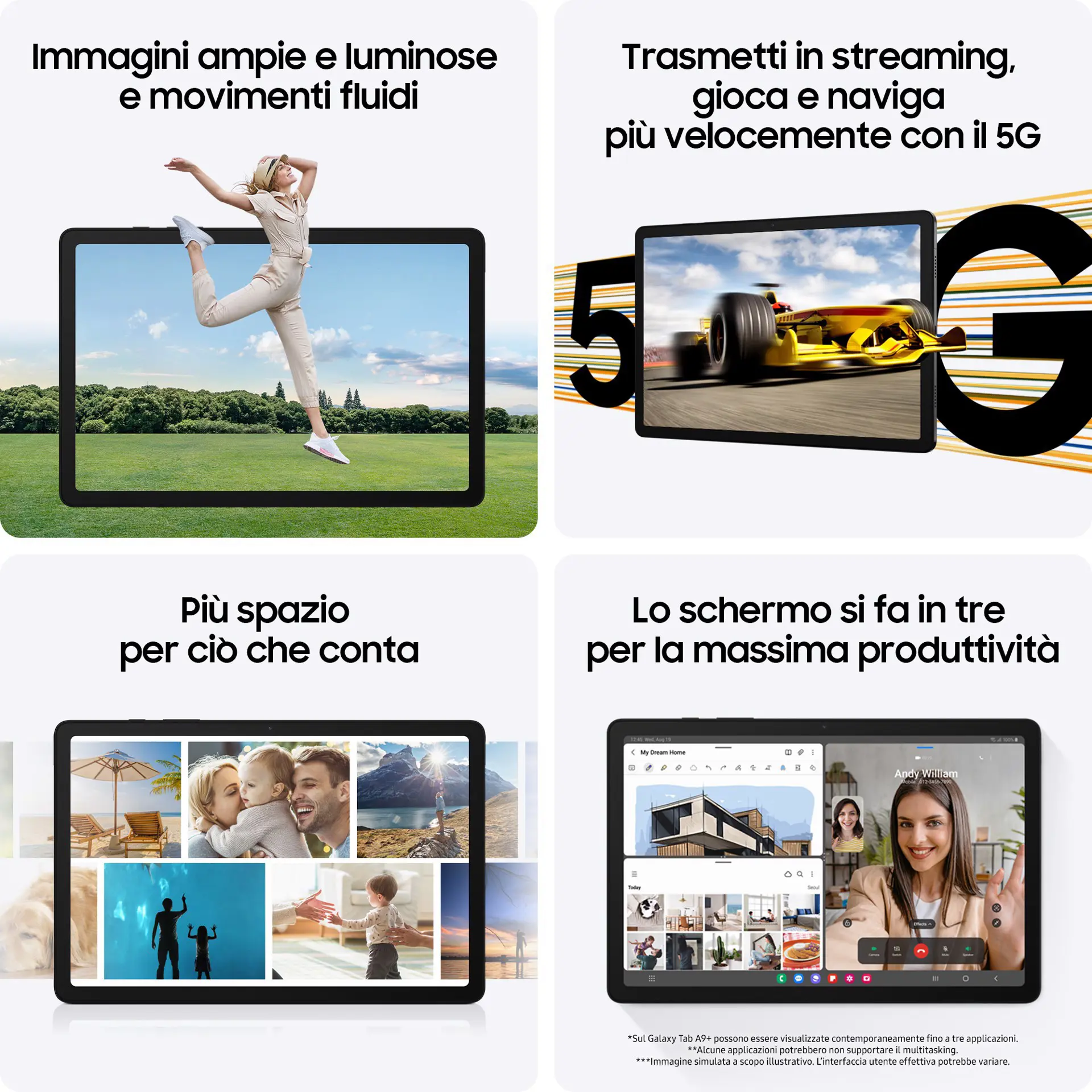 Samsung Galaxy Tab A9+ SM-X210RZAREUE. Dimensioni diagonale schermo: 27,9 cm (11"), Risoluzione del display: 1920 x 1200 Pixel. Capacità memoria interna: 128 GB. Famiglia processore: Qualcomm Snapdragon, Modello del processore: SM6375. RAM installata: 6 GB. Risoluzione fotocamera posteriore (numerico): 8 MP, Tipo di fotocamera posteriore: Fotocamera singola, Risoluzione fotocamera frontale (numerico): 5 MP. Wi-Fi standard: Wi-Fi 5 (802.11ac). Assistenza funzione GPS (A-GPS). Lettore di schede integrato. Peso: 480 g. Sistema operativo incluso: Android 13. Colore del prodotto: Grafite