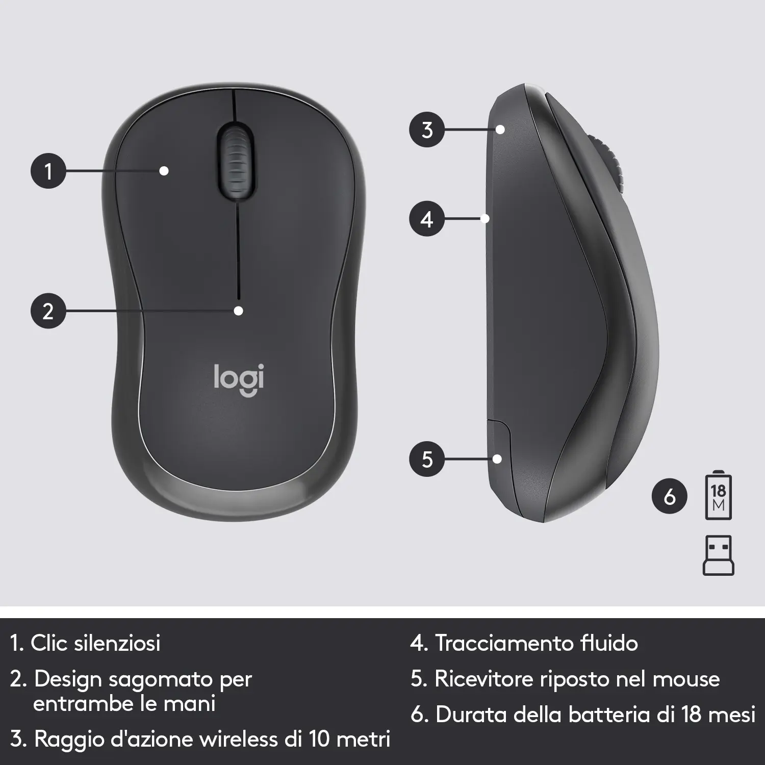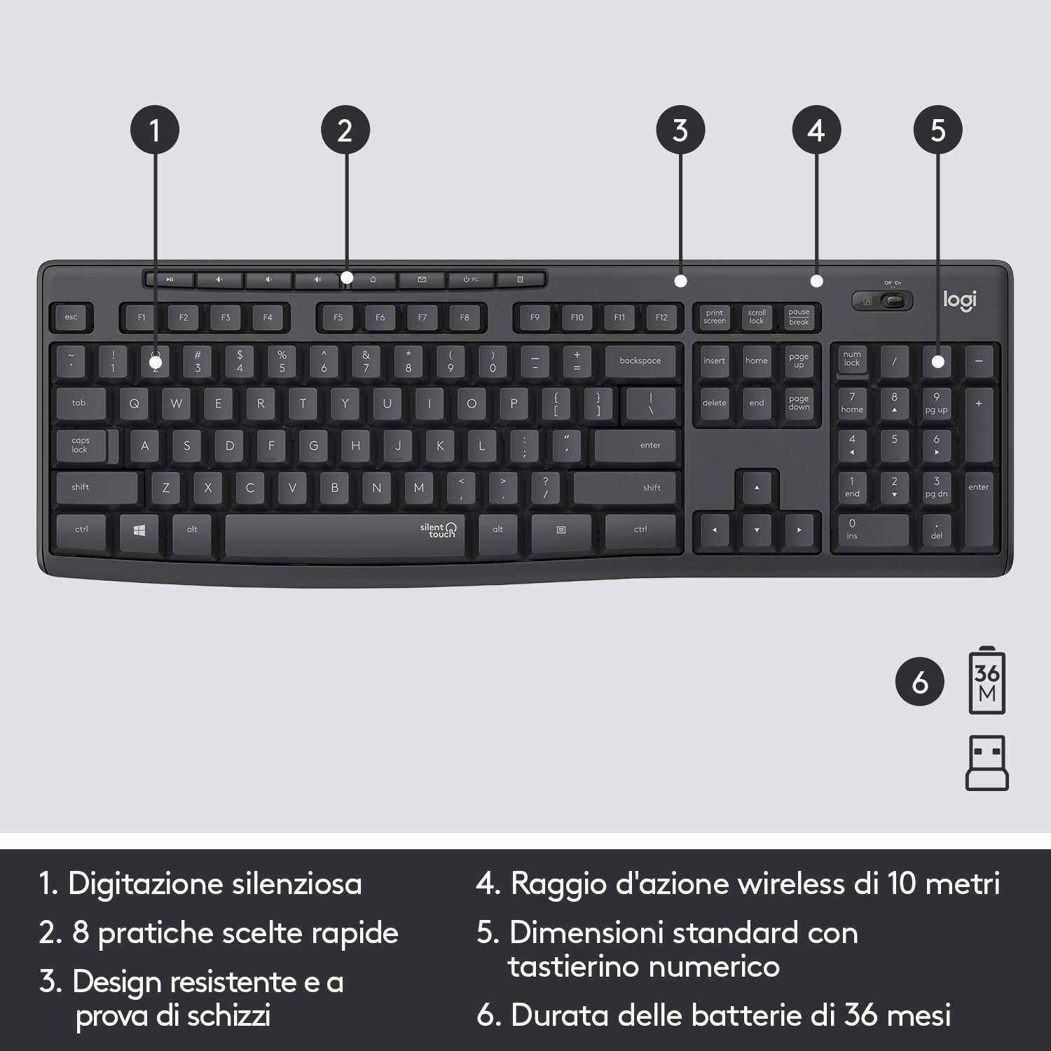 Logitech MK295 Kit Mouse e Tastiera Wireless – Tecnologia SilentTouch, Tastierino Numerico, Tasti Scelta Rapida, Tracciamento Ottico Avanzato, Ricevitore USB Nano, Senza Lag, Meno 90% di Rumore, Full-size (100%), USB, QWERTY, Grafite, Mouse incluso