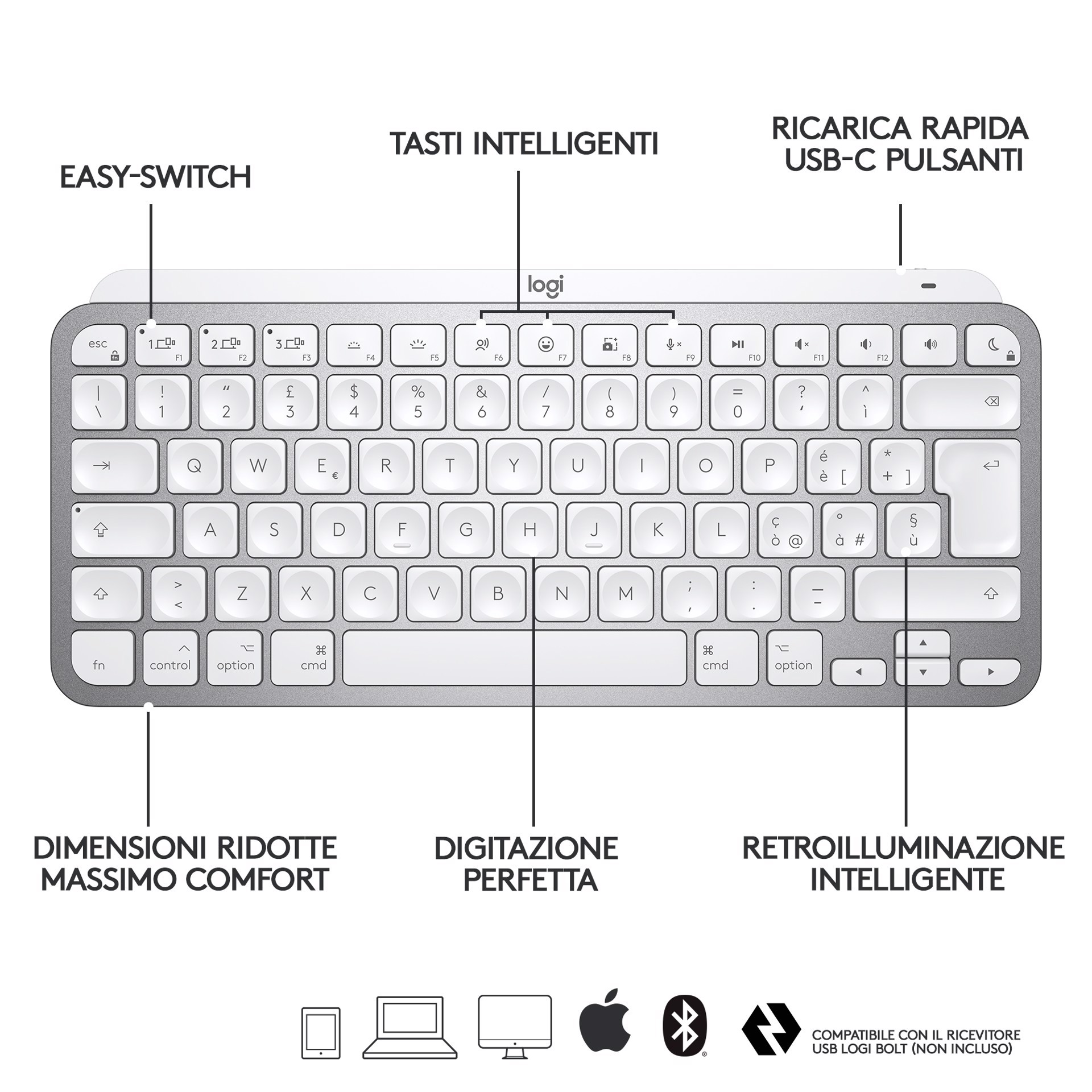 LOGITECH MX Keys Mini per Mac Tastiera Wireless, Minimal, Compatta, Bluetooth, Tasti Retroilluminati, USB-C, Digitazione Tattile, Compatibile con Apple macOS, iPad OS, in Metallo