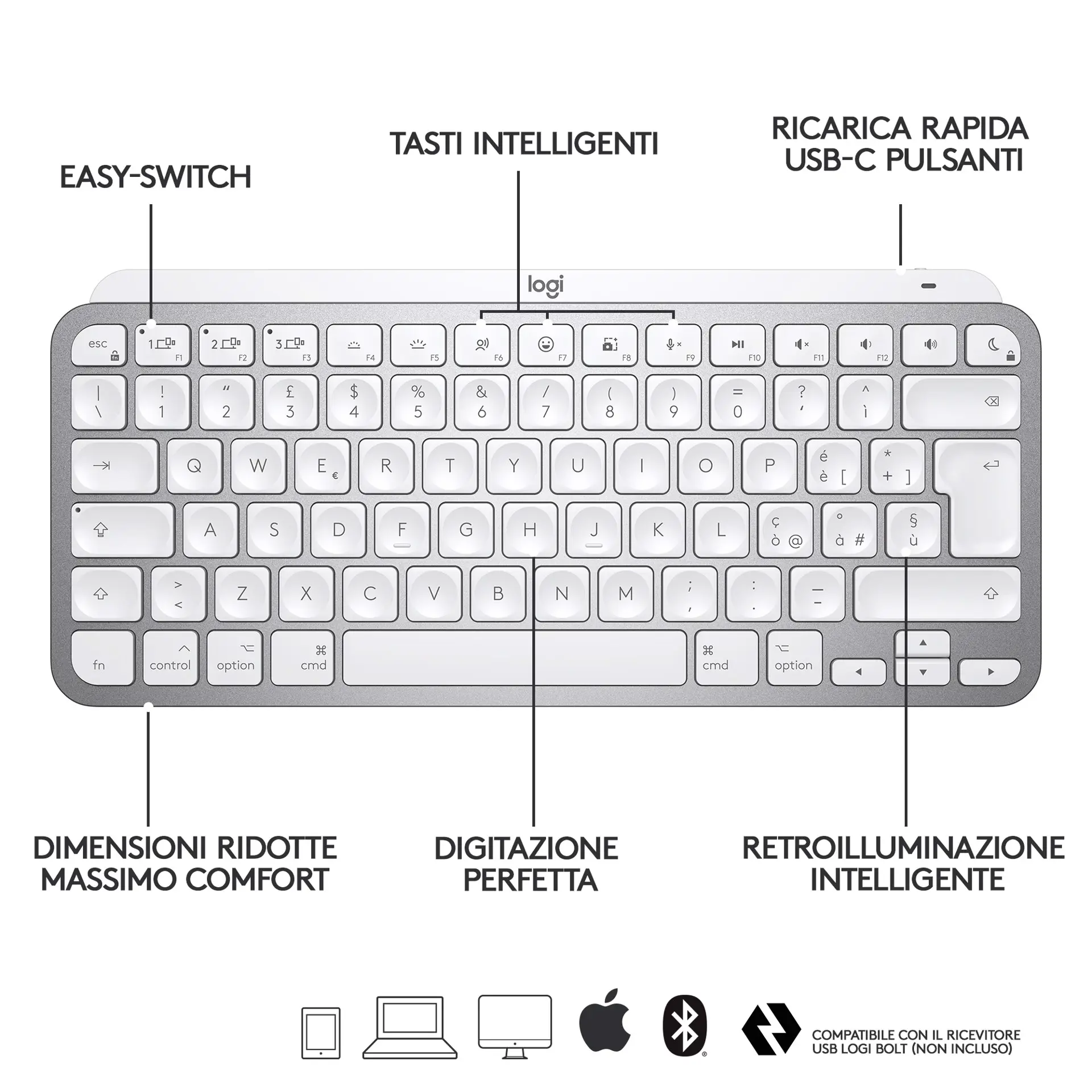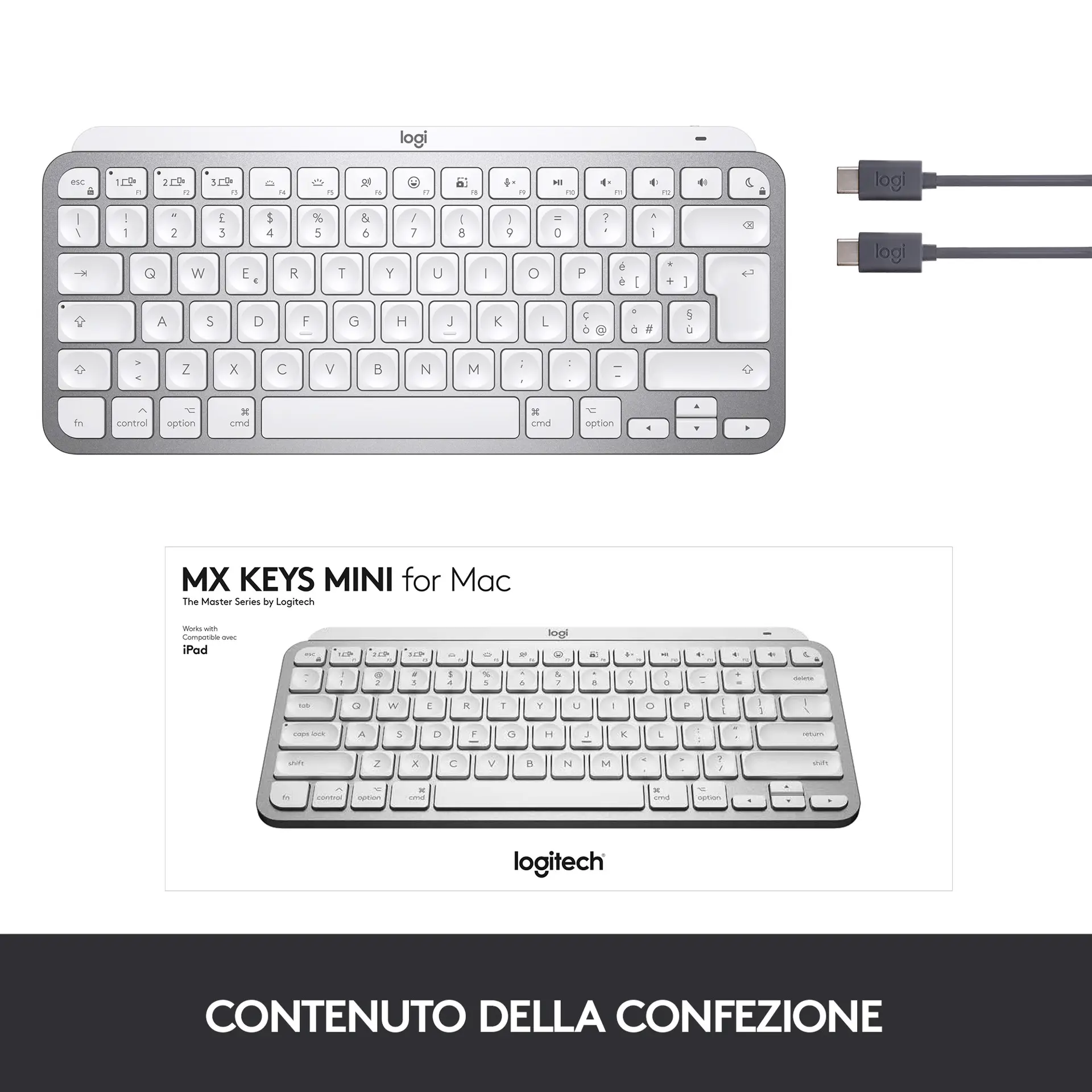 Logitech MX Keys Mini per Mac Tastiera Wireless, Minimal, Compatta, Bluetooth, Tasti Retroilluminati, USB-C, Digitazione Tattile, Compatibile con Apple macOS, iPad OS, in Metallo
