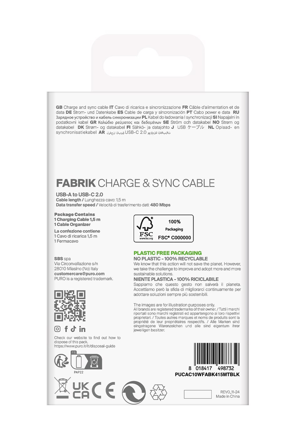 Puro Cavo in tessuto "FABRIK" da USB-A a USB-C, 1,5m, 2.0, 10W, Nero