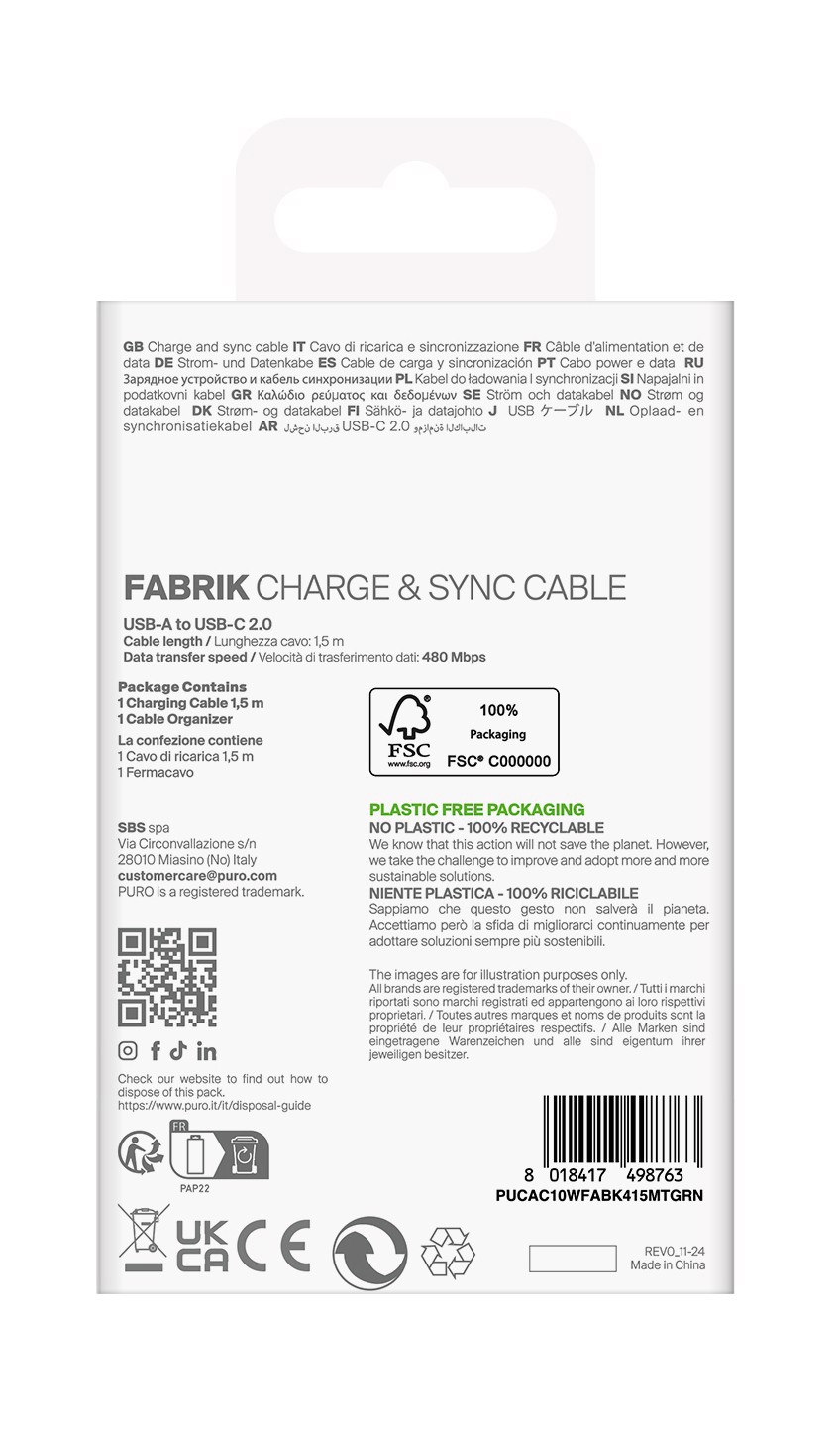 Puro Cavo in tessuto "FABRIK" da USB-A a USB-C, 1,5m, 2.0, 10W, Verde