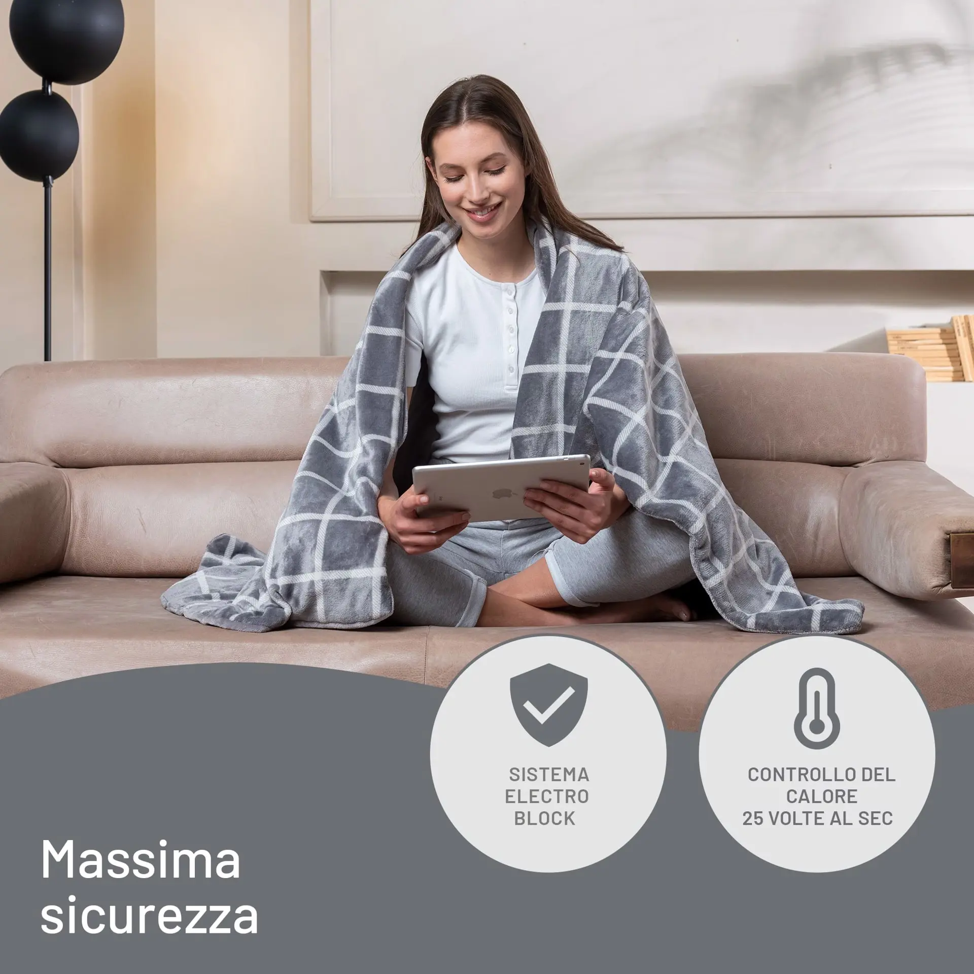 Con il plaid riscaldabile IMETEC ADAPTO VELVET SQUARE scegli tu il caldo che vuoi per un comfort straordinario, sul divano nelle fredde sere invernali o all’esterno quando arrivano i primi freddi ma preferisci rimanere all’aperto. Alla morbidezza naturale del tessuto aggiunge il comfort del calore extra che più ti piace e ti fa stare bene: lo accendi, selezioni la temperatura ed è subito caldo. In caldo e morbido tessuto vellutato e setoso con disegno square, double face, dona un tocco di eleganza alla tua zona living. La tecnologia Adapto garantisce performance più elevate in termini di rapidità e comfort grazie ad un innovativo software certificato. Sfrutta tutta la sua potenza di 150 W per un riscaldamento rapido; raggiunto il livello di calore desiderato, riduce la potenza e regola e mantiene costante la temperatura in base a quella del corpo e dell’ambiente, per un comfort insuperabile. Puoi scegliere tra 6 temperature e programmare lo spegnimento dopo 1-3-9 ore. Con il plaid puoi risparmiare restando al caldo perché consuma pochi cent per utilizzo. Con il plaid puoi risparmiare restando al caldo perché consuma pochi cent per utilizzo. La sicurezza è garantita dall’esclusivo sistema di controllo digitale Electro Block® con funzione di auto-diagnosi ad ogni accensione: verifica l’efficienza e la sicurezza di tutti i componenti, monitora costantemente il plaid durante l’uso e, in caso di anomalie, interviene tempestivamente spegnendo il prodotto. Dimensioni 150x95 cm.