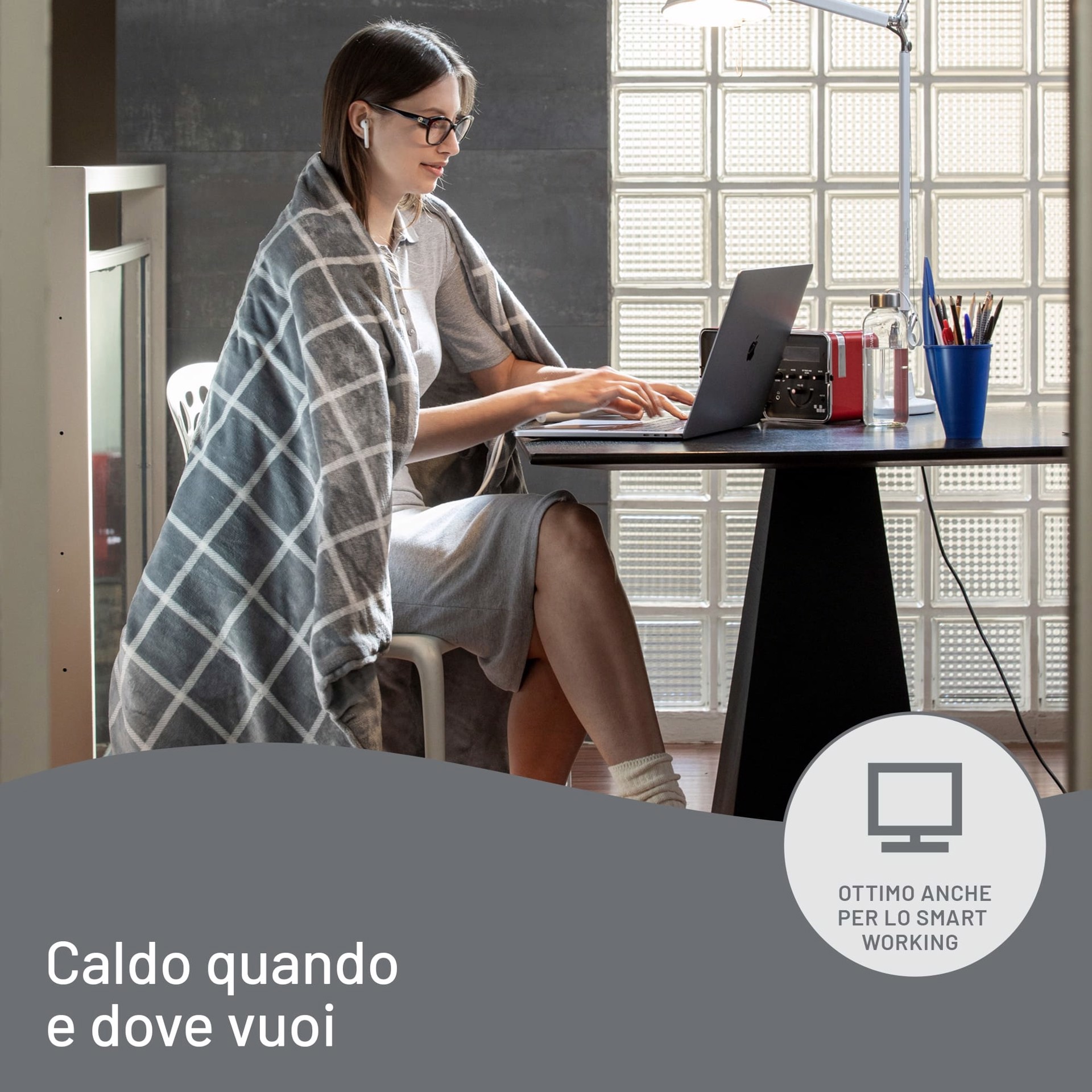 Lasciati coccolare dal calore unico e personalizzato del plaid riscaldabile IMETEC ADAPTO VELVET SQUARE. Utilizzalo per i tuoi momenti di relax sul divano, in poltrona e anche all'aperto. È ideale per stare sempre al caldo anche in smart working consumando pochissimo: lo accendi, lo imposti e pensa a tutto lui adattando la temperatura a quella del tuo corpo e dell'ambiente. In morbido tessuto vellutato e setoso con disegno square double face. Dimensioni 150x95 cm.