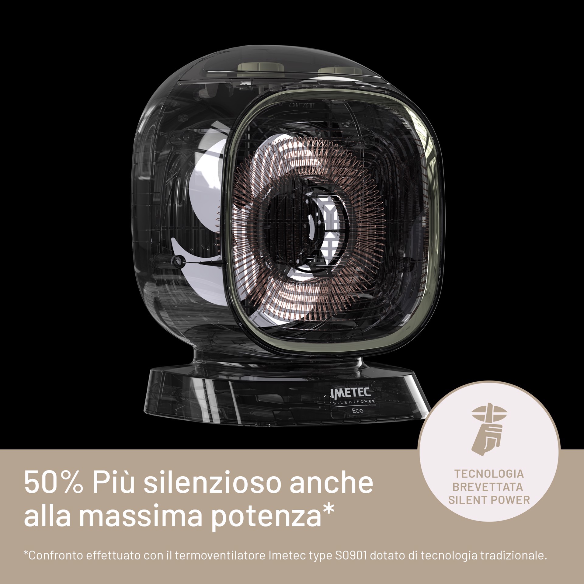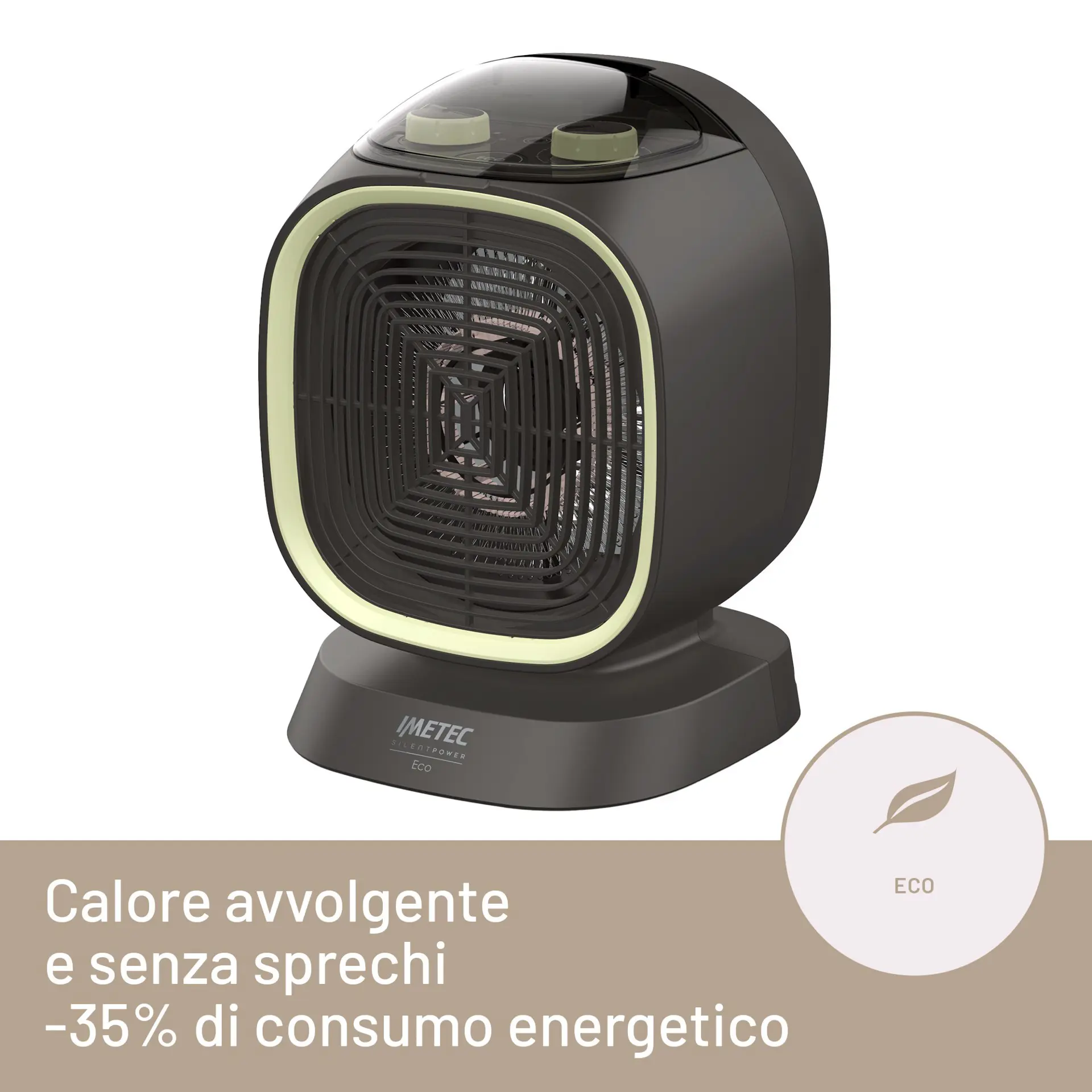 Il termoventilatore IMETEC ECO è dotato dell'esclusiva tecnologia brevettata SILENT POWER® di Imetec. Questa tecnologia innovativa nasce dalla consolidata esperienza di Imetec nel mondo del riscaldamento e permette di riscaldare l’ambiente in modo rapido, sicuro e super silenzioso.