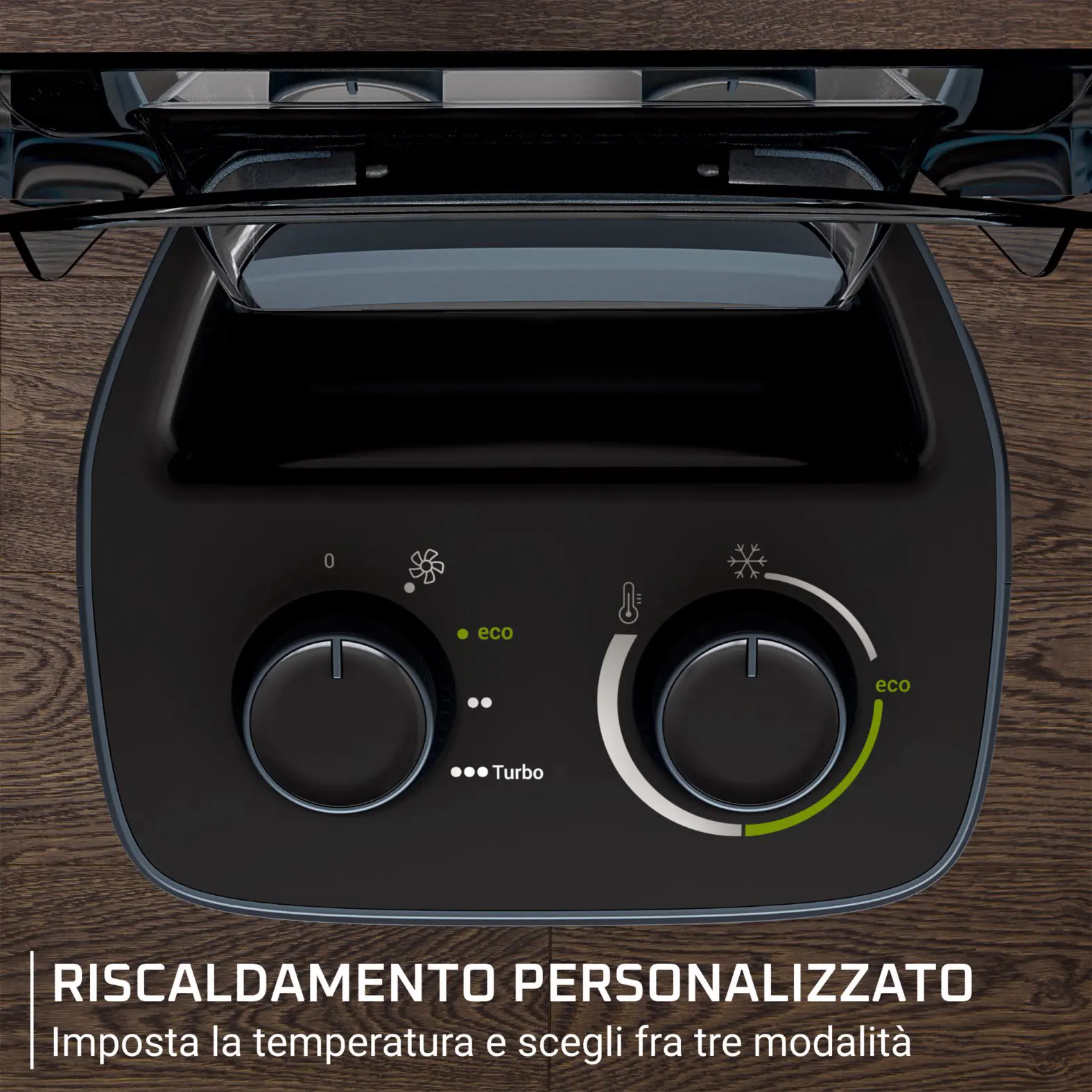 tue esigenze: la modalità ECO consente di risparmiare fino al 50% di energia, la modalità intermedia assicura un uso silenzioso, mentre la modalità turbo offre un riscaldamento rapido e potente. Inoltre, grazie al suo design con coperchio in plastica, Intense Comfort Aqua può essere utilizzato anche in bagno in tutta tranquillità.