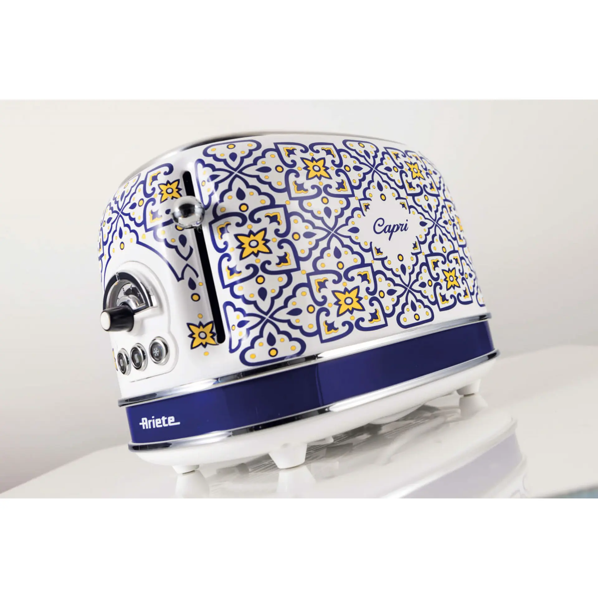 Design raffinato e funzionalità all’avanguardia per trasformare la cucina in un’oasi di bellezza, il fascino mediterraneo di questa gamma è ispirato allo stile unico e vibrante della meravigliosa località di Capri. Il tostapane elettrico della linea Capri di Ariete tosta contemporaneamente 4 fette di pane, senza pinze, con 2 scomparti separati, con la possibilità di scegliere il grado di doratura e tostatura del pane che più preferisci, grazie ai 6 livelli selezionabili tramite la manopola. Le fette vengono espulse automaticamente una volta tostate, evitando spiacevoli bruciature, e le pareti fredde ti garantiscono la massima sicurezza durante l'utilizzo. Tostando 2 fette di pane contemporaneamente, potrai preparare velocemente il pane tostato per le tue colazioni americane o per i brunch con gli amici, ma non solo: con il Tostapane Capri Ariete è possibile anche attivare la funzione defrost, per scongelare in pochi istanti e tostare sandwich e panini imbottiti, per gustose merende o per le pause pranzo più veloci.