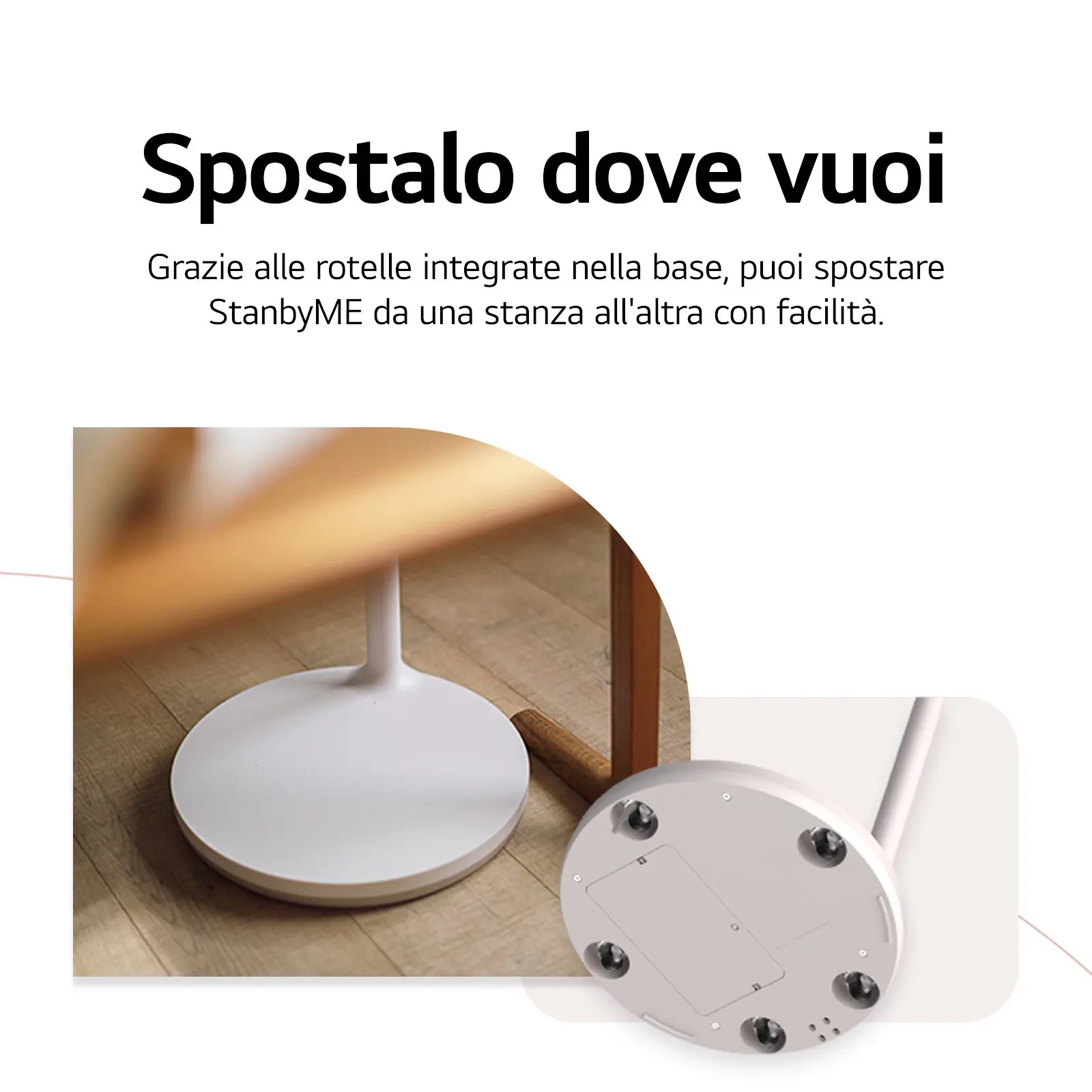 LG ha progettato il nuovo StanbyME per essere estremamente versatile da usare. Il suo design a stelo è snello ed elegante e ti permette di orientare lo schermo come preferisci. Puoi ruotarlo in posizione verticale, girarlo a destra o sinistra fino a 150°, inclinarlo fino a 50° e regolarne l'altezza. Inoltre, grazie alla base con 5 ruote, puoi portarlo facilmente da una stanza all'altra.