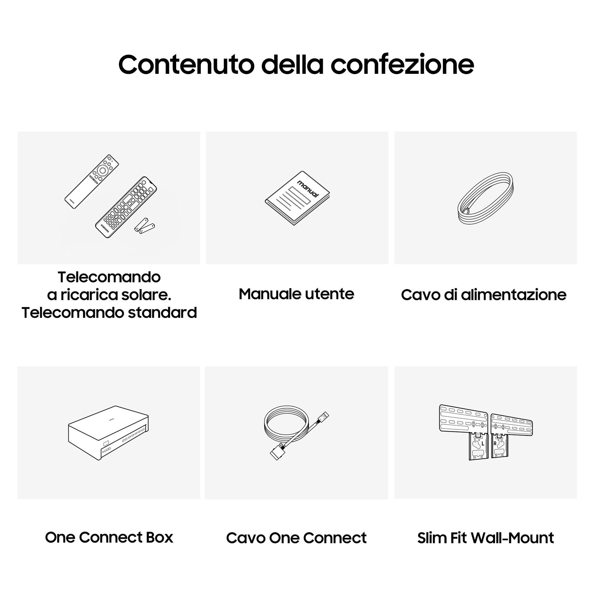 Tecnologie Samsung (AV/TV)4K AI Upscaling, AI Auto Game Mode, Adaptive Sound Pro, Art Mode, Auto HDR Remastering, Dual LED, EyeComfort Mode, Hub di gioco, Micro Dimming, Motion Xcelerator, One Connect Box, Q-Symphony, Real Depth Enhancer, Samsung TV Plus, Workspace
