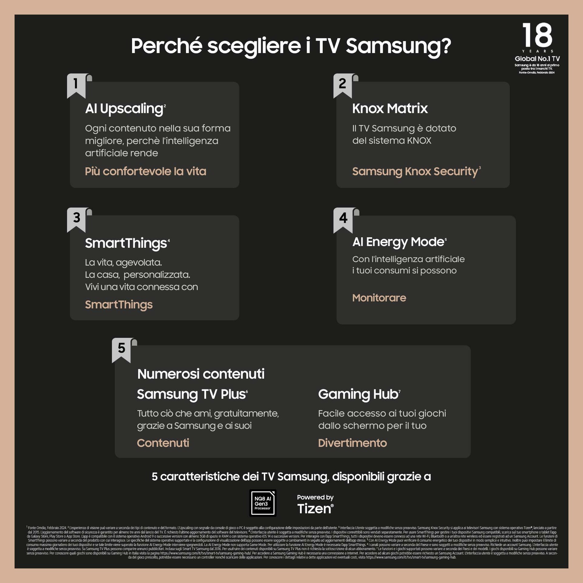 | Tecnologie Samsung (AV/TV) | 4K AI Upscaling, Active Voice Amplifier Pro, Adaptive Sound Pro, AirPlay 2, AirSlim, Amazon Alexa Built-in, Ambient Mode+, Built-in SmartThings Hub, Contrast Enhancer, Dual LED, HDR10+, Micro Dimming, Motion Xcelerator, Object Tracking Sound Lite, Q-Symphony, Quantum HDR, Processore Quantum 4K, Samsung Health, Samsung TV Plus, Slim Fit Wall-Mount, Smart Calibration, Smart TV powered by Tizen, Supreme UHD Dimming, Wide Viewing Angle, Works With Amazon Alexa |