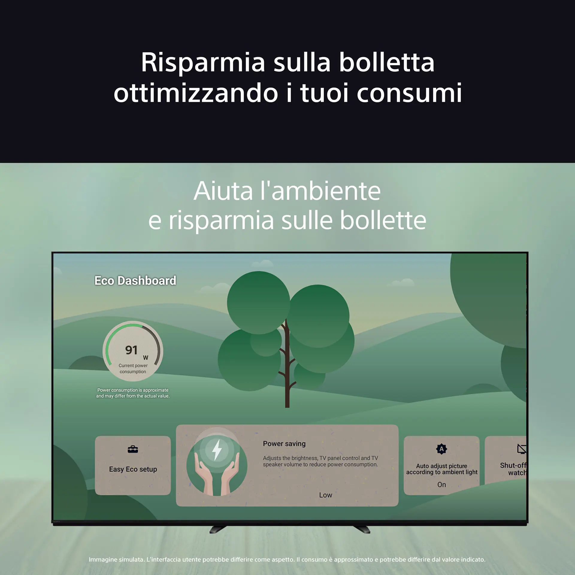 Puoi anche monitorare e regolare facilmente le impostazioni energetiche per un'efficienza ottimale utilizzando Eco Dashboard 2(6). Complessivamente,con questo televisorepotresti risparmiare fino a €XXX sulla bolletta energetica(7).