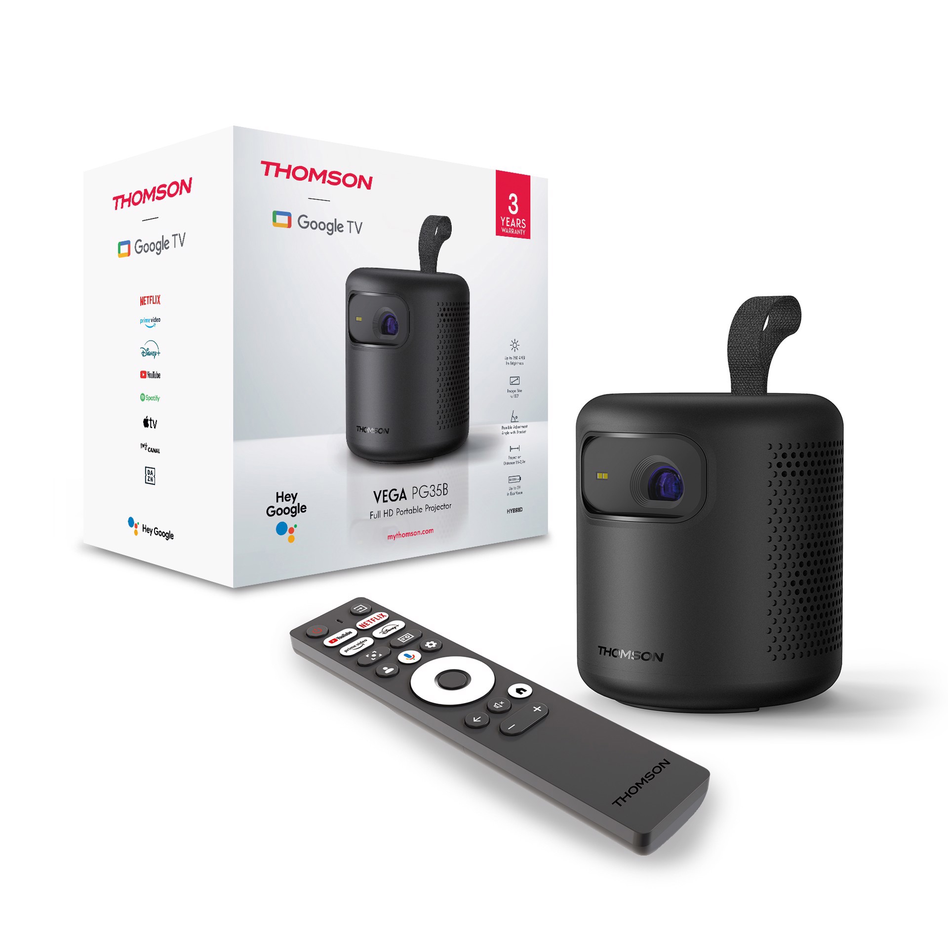 Thomson Videoproiettore LED Vega 600ANSI lumen Full HD. Luminosità proiettore: 600 ANSI lumen, Risoluzione nativa del proiettore: 1080p (1920x1080), Rapporto di contrasto: 350:1. Tipo di sorgente luminosa: LED, Durata della sorgente luminosa: 30000 h. Messa a fuoco: Auto. Modalità video supportate: 480i, 480p, 576i, 576p, 720p, 1080i, 1080p. Tipo di connettore HDMI: Taglia piena