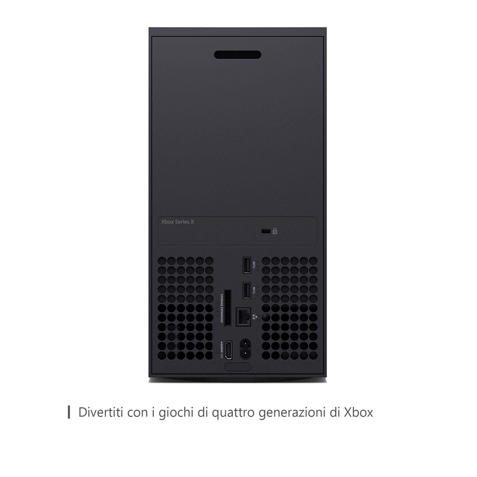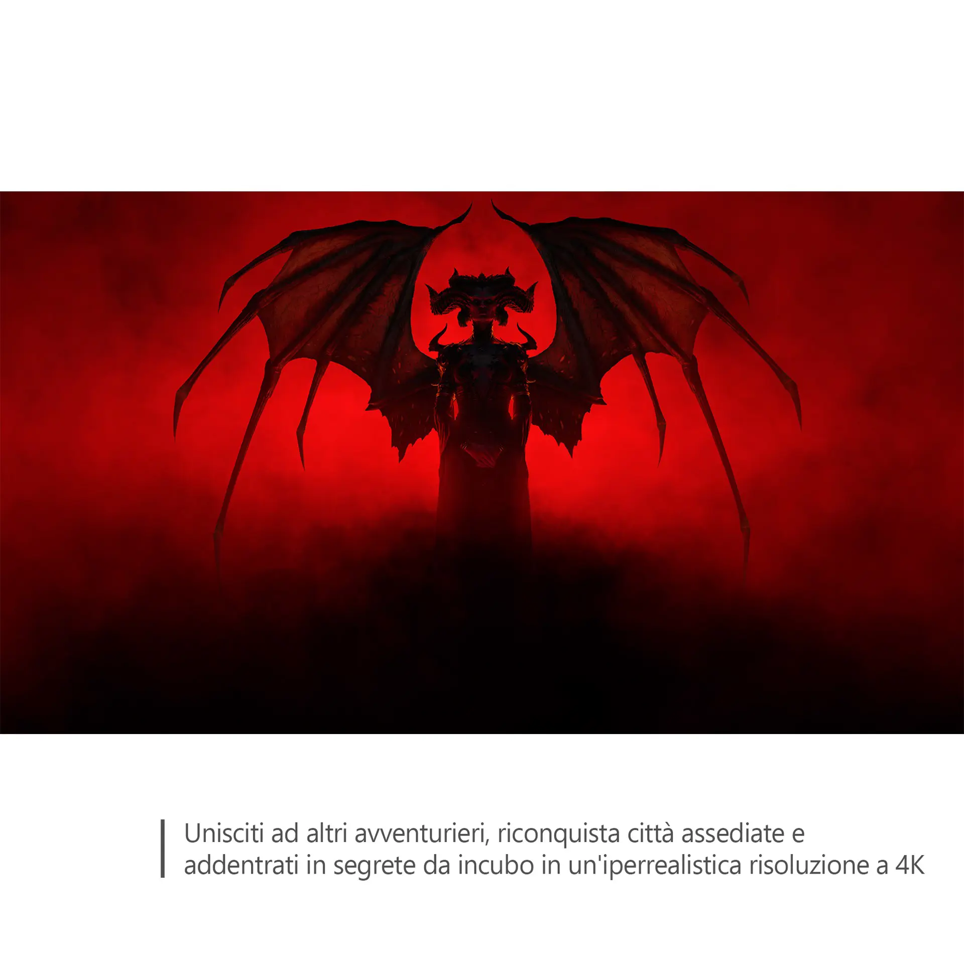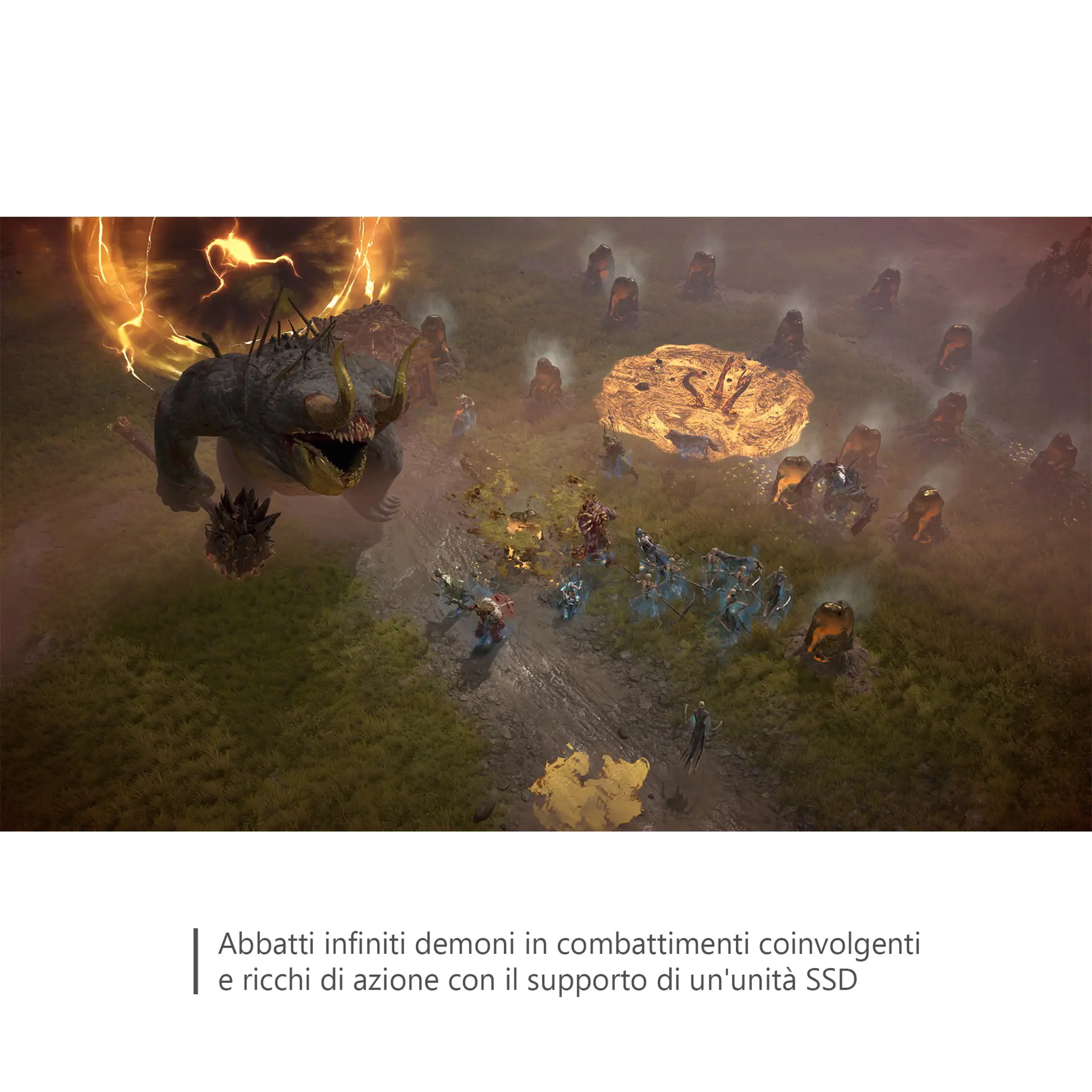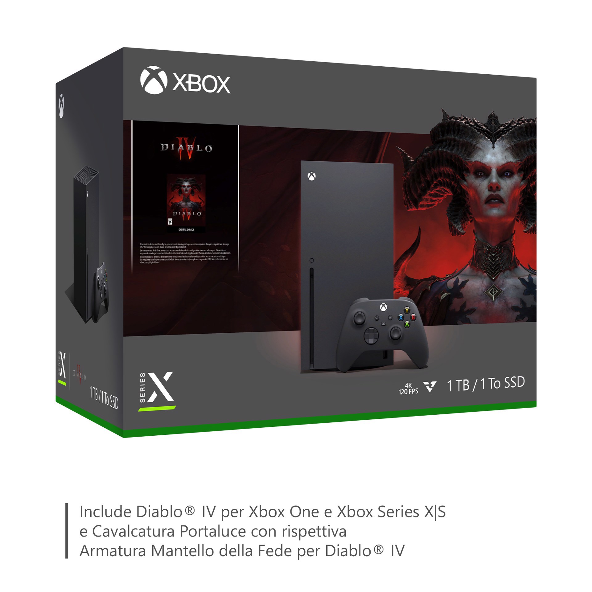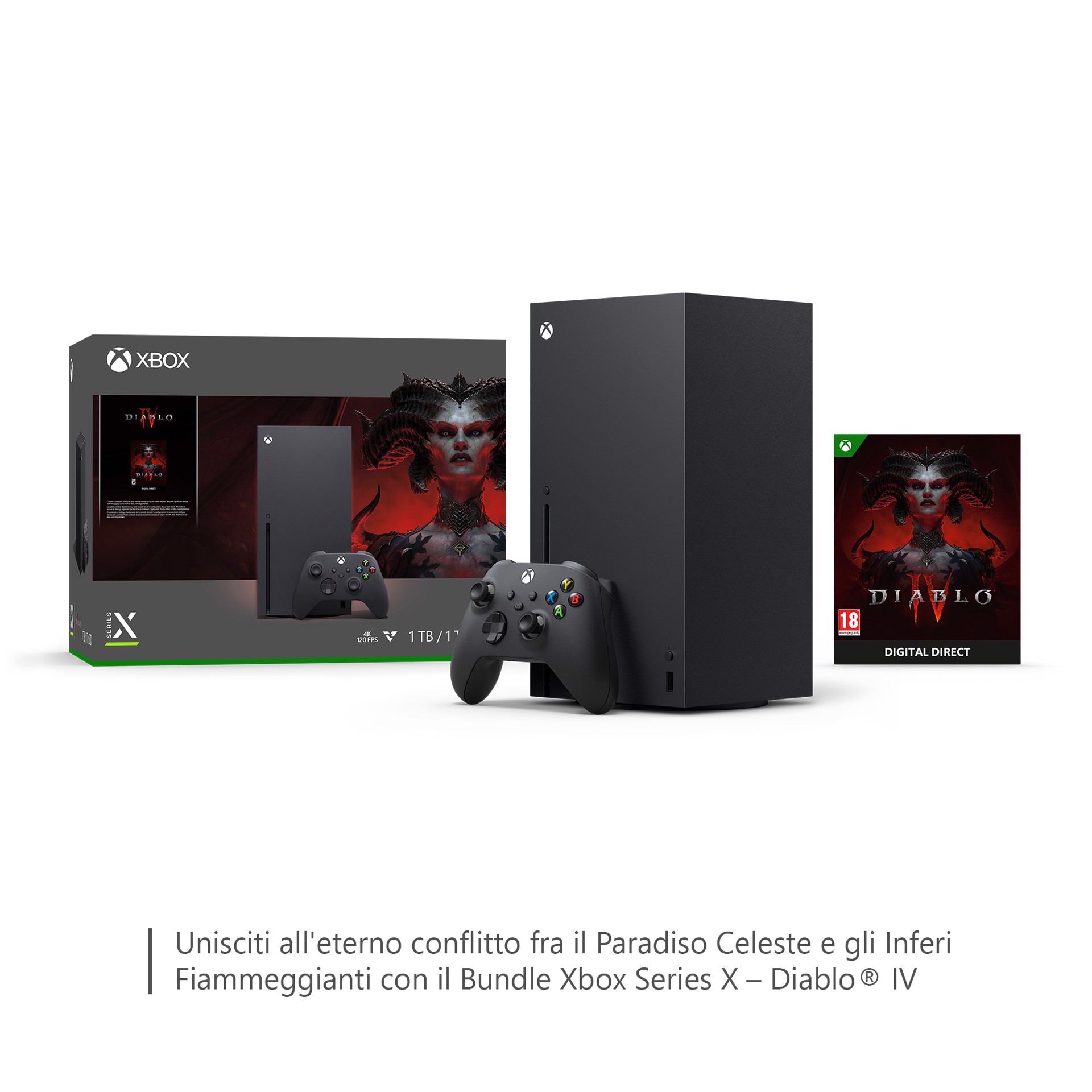 Microsoft Xbox Series X - Diablo IV. Piattaforma: Xbox Series X, Colore del prodotto: Nero, RAM installata: 16000 MB. Supporto di memoria: SSD, Capacità memoria interna: 1 TB, Tipo drive ottico: Blu-Ray/DVD. Velocità trasferimento Ethernet LAN: 10,100,1000 Mbit/s, Tipo di interfaccia Ethernet: Fast Ethernet, Gigabit Ethernet, Standard Wi-Fi: 802.11a, 802.11b, 802.11g, Wi-Fi 4 (802.11n), Wi-Fi 5 (802.11ac). Tipologia HD: 8K Ultra HD, Formato audio integrato: DTS 5.1, Dolby Digital 5.1, Dolby TrueHD, Formati audio supportati: PCM. Genere consigliato: Bambino/Bambina