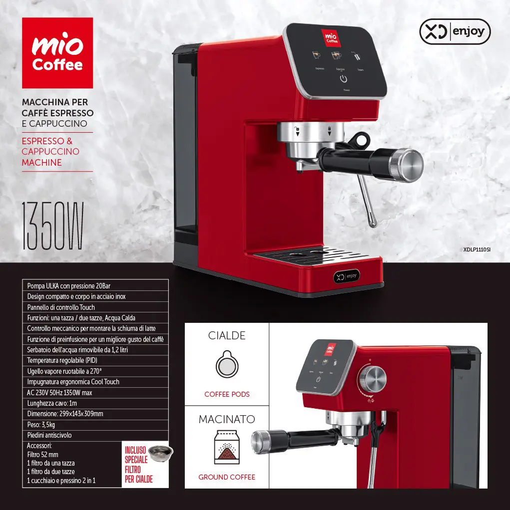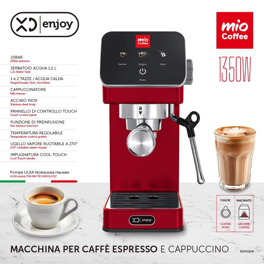 XD Enjoy Macchina per Caffè Espresso e Cappuccino 1350W, Macchina per espresso, 1,2 L, Cialde caffè, Caffè macinato, 1350 W, Rosso